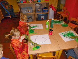 We versieren ook de kerstbomen aan de kast met verschillende figuurtjes in vrolijke kleurtjes.
